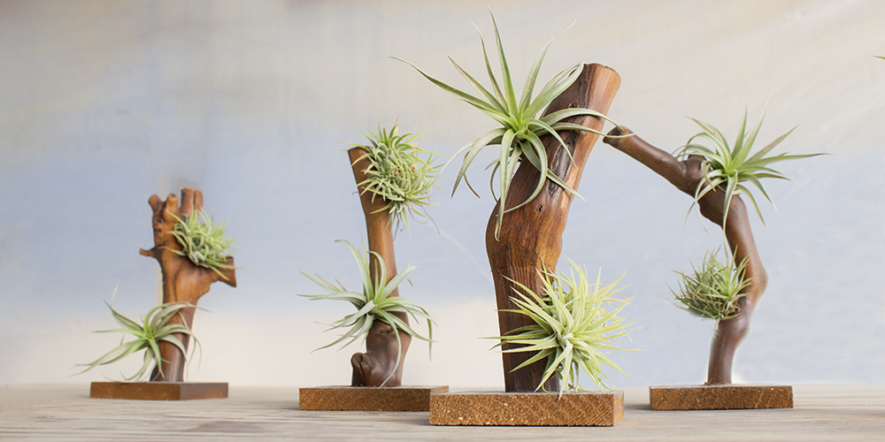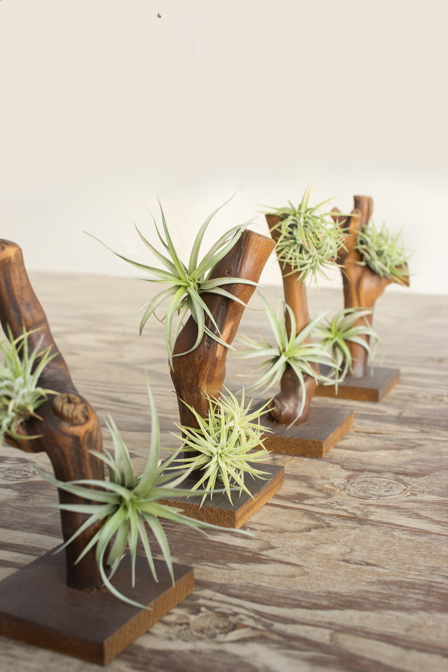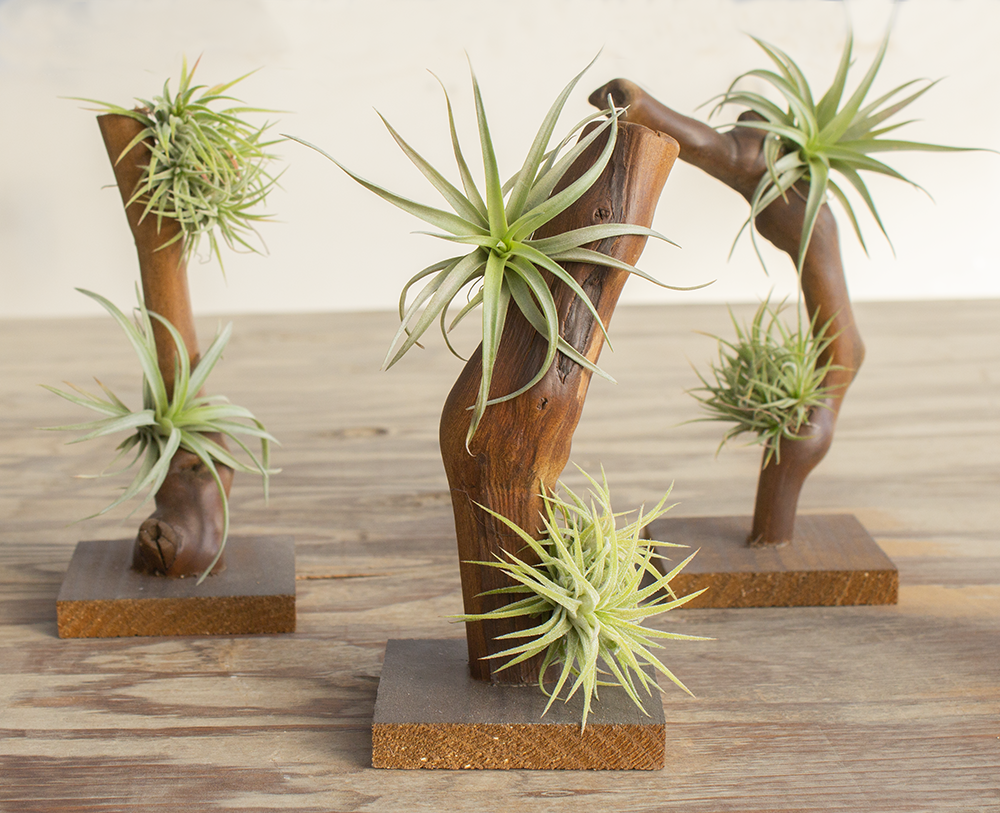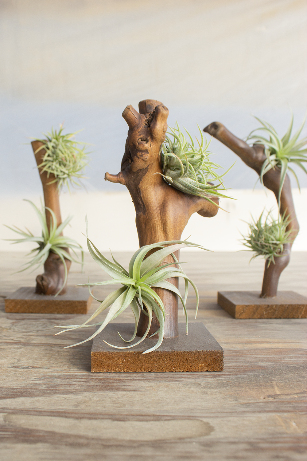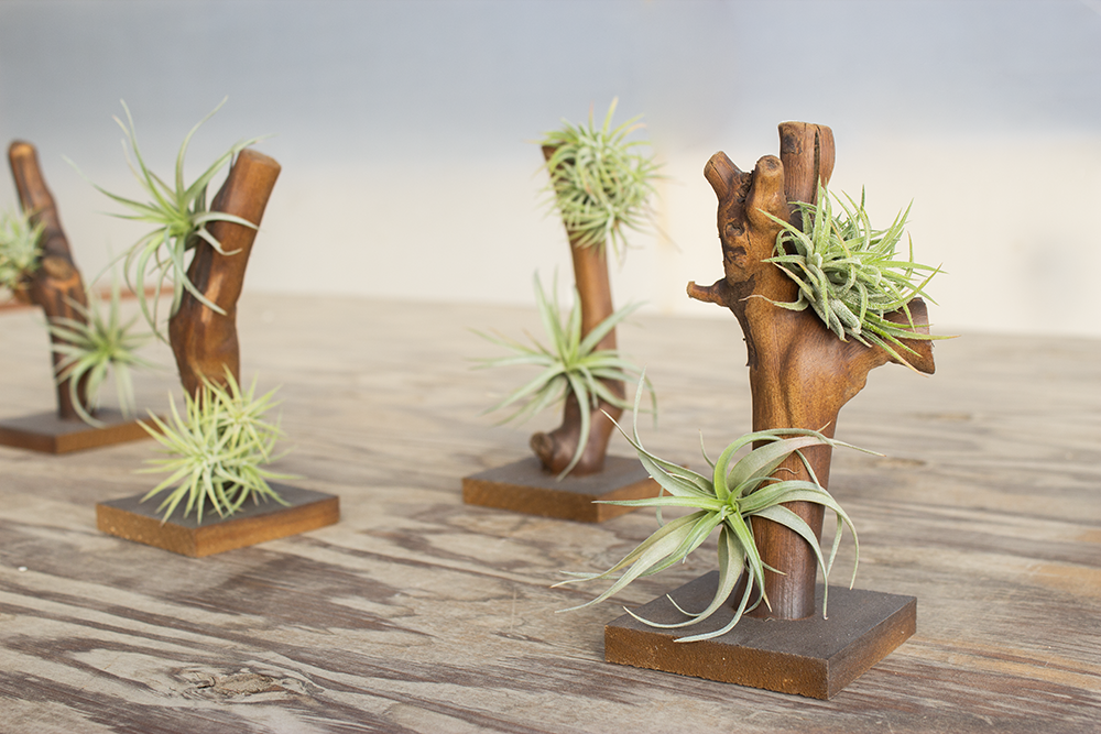 These little trees are great examples of the timeless look of Airplants. These are all handmade in house, and each one has its own distinct look. These are not your typical mass retail item. Each is treated with an exterior stain to withstand the elements. They include 2 plants, one being a clump!