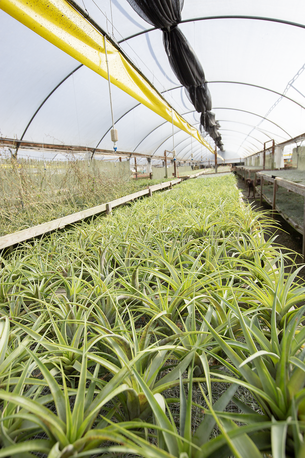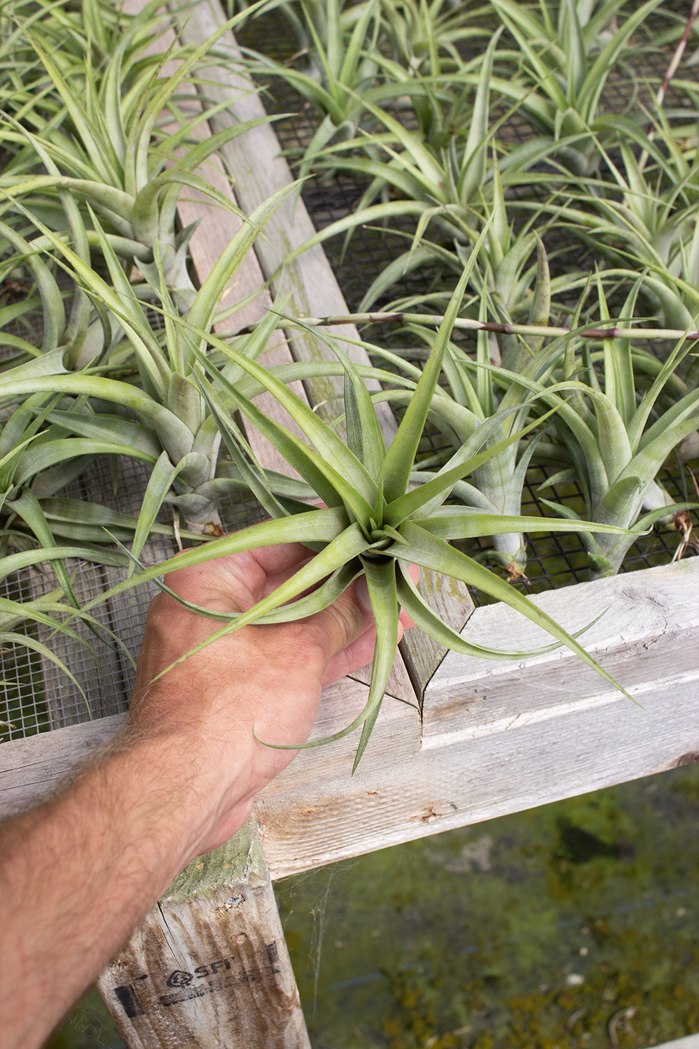 This variety is unusual because it grows pups right on its inflorescence. This plant is deep green, and can grow up to 14" wide.
