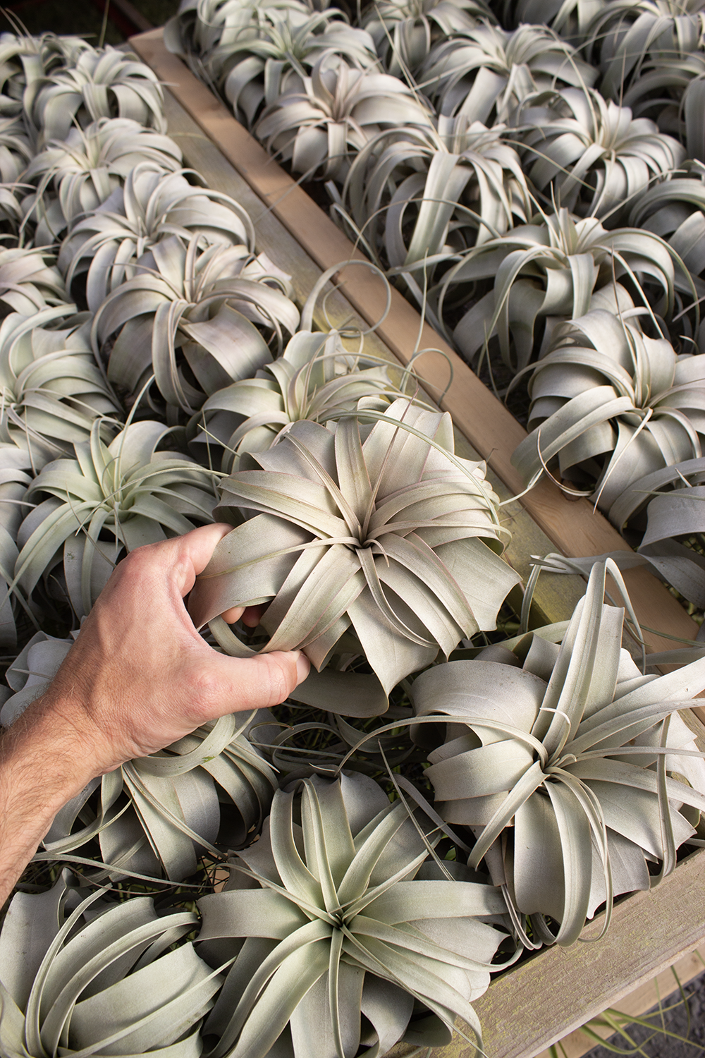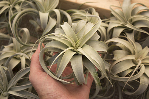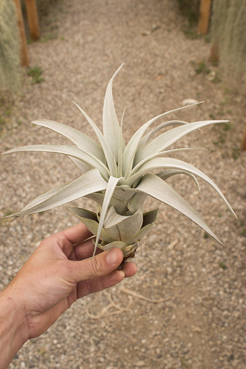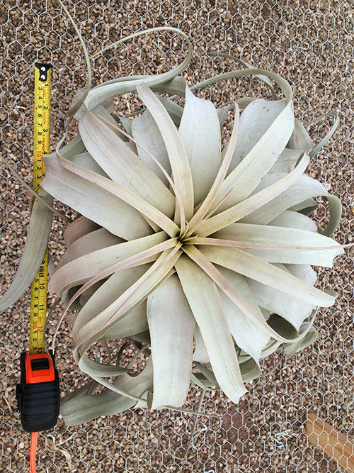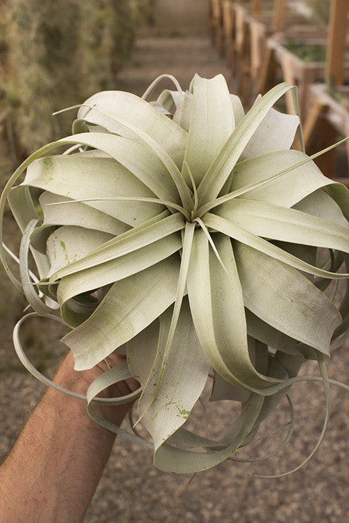 Also known as the King of Airplants, tillandsia Xerographica is a staple variety. It grows large, as large as 36" wide! It produces a multi branching red and yellow bloom with violet flowers. The plant also has a curled over look with a silver color!