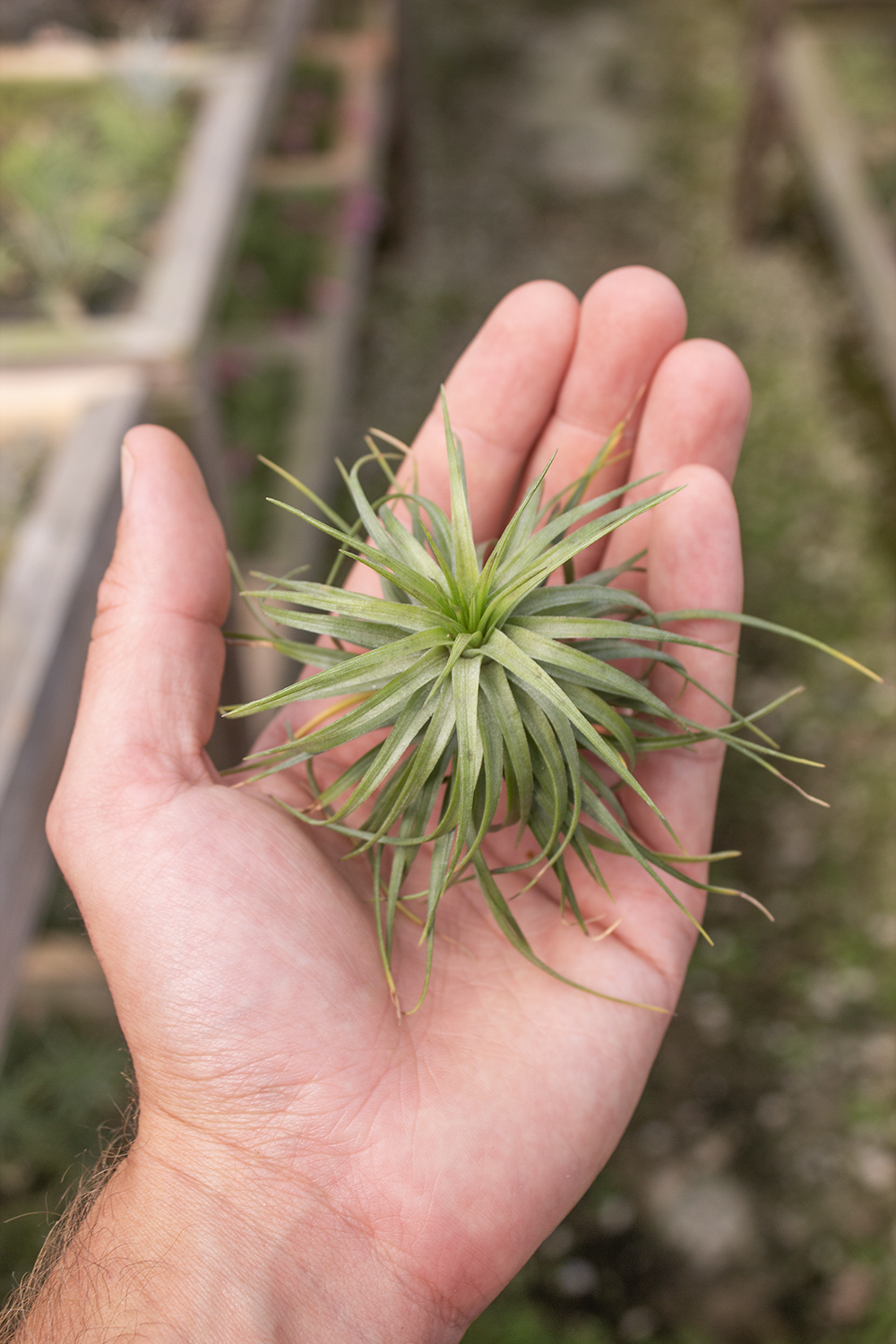 Tillandsia Stricta Curly Hybrid is an attractive air plant known for its distinctive, curly leaves that create a unique and whimsical appearance. The leaves are typically green with a silvery sheen and are tightly coiled, giving the plant a compact rosette shape.
