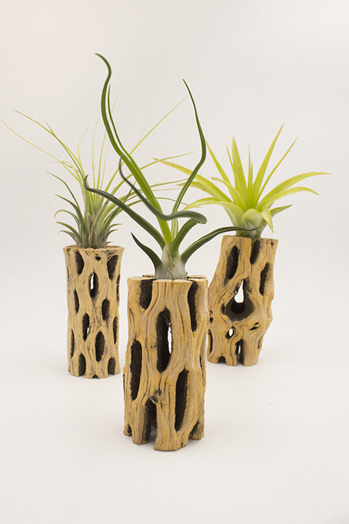 Cholla wood is technically cactus skeleton. This particular form of Cholla is called Stag Horn. We sell many variations and sizes of the wood. The product is salt free, so its great for mounting air plants to. The inside diameter (1/2") can only hold small plants. Plant sold separately.