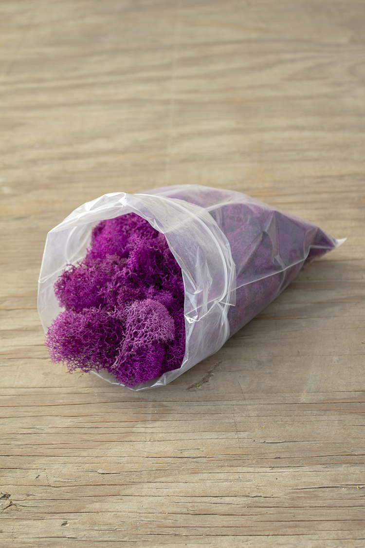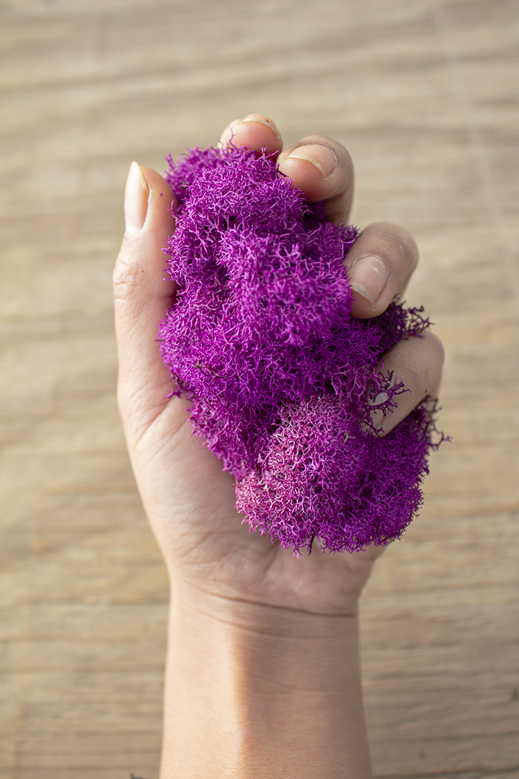 This is dyed and dried reindeer moss. It is great for designing with, and does not require water.